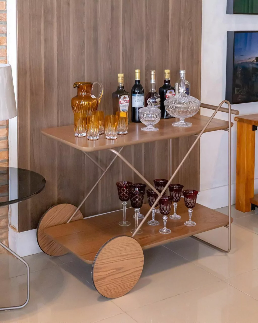 Carro Bar Franz - Ellipse Móveis. As linhas delicadas do Carrinho Franz criam superfícies e texturas que se integram num móvel de grande utilidade e beleza. Podendo ser usado em diversos ambientes como salas, varandas cobertas, banheiros ou quartos como apoio para objetos de utilização diária com estilo e muita personalidade. Produto desenvolvido pelo designer Ále Alvarenga.