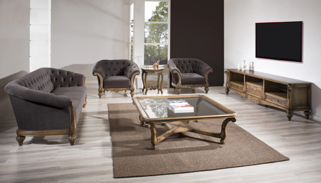 Conjunto Clássico Mesa Centro com Sofá e Poltronas e Rack - LUXO