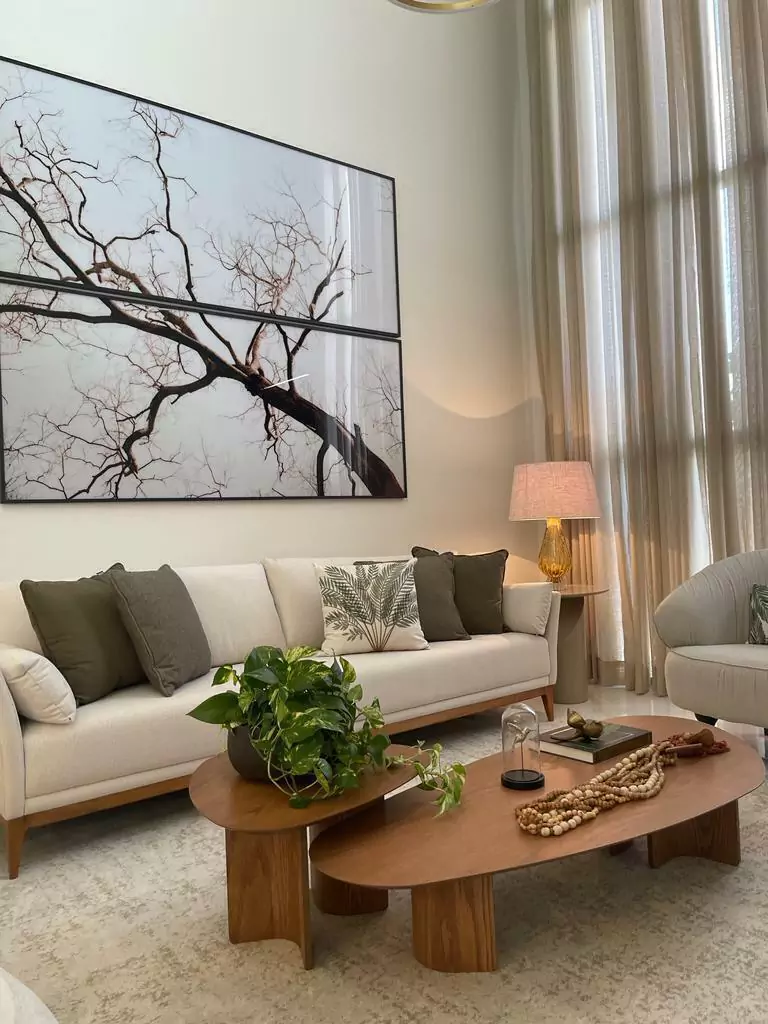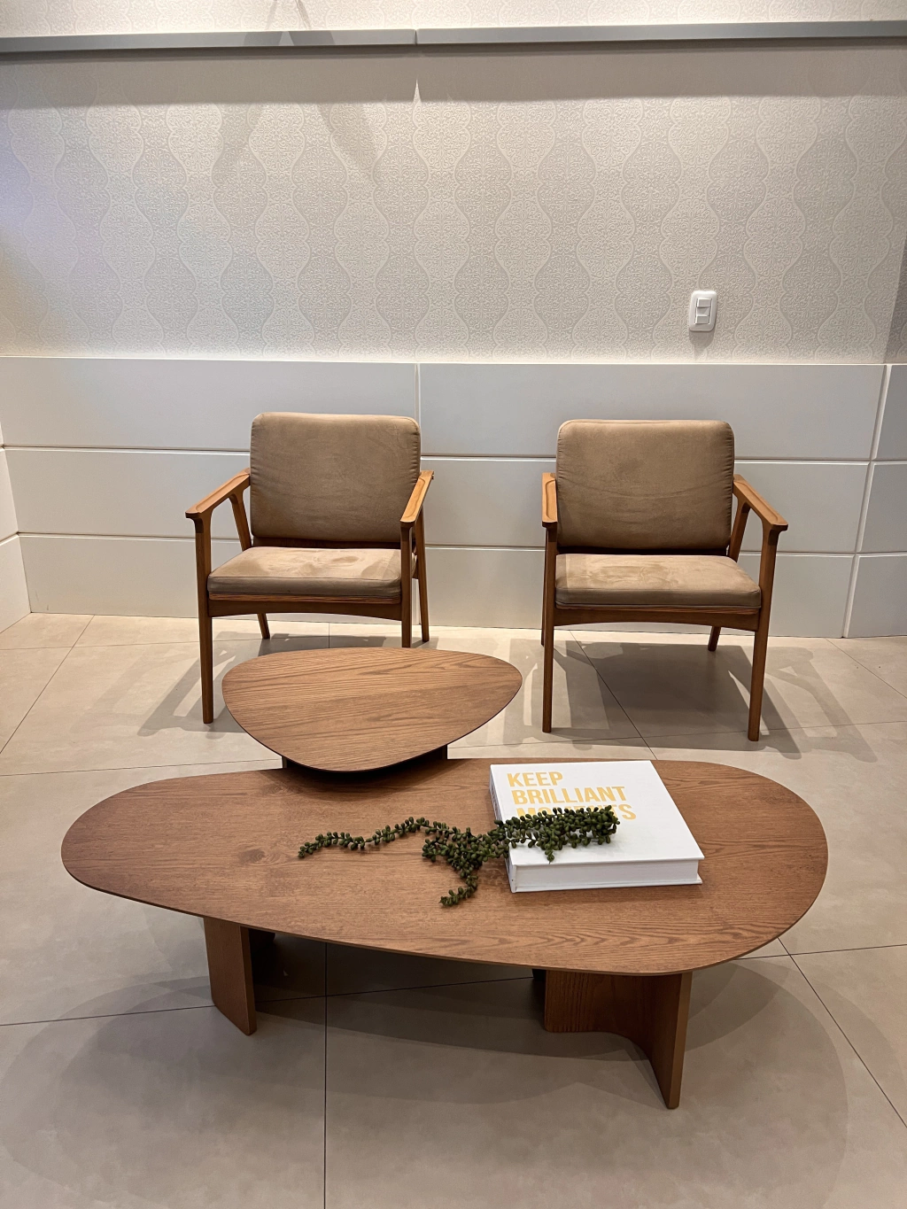 Mesas de centro modernas e sofisticadas. Possuem uma proposta orgânica, com mescla de acabamentos e alturas, trazendo movimento e leveza ao ambiente.