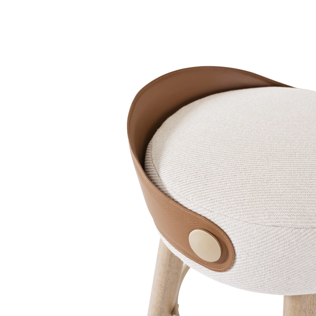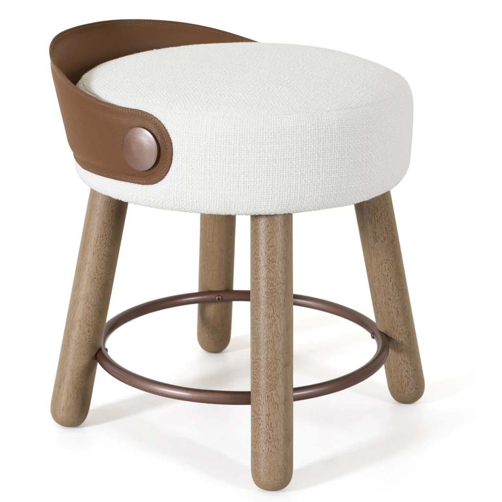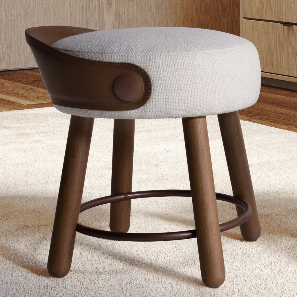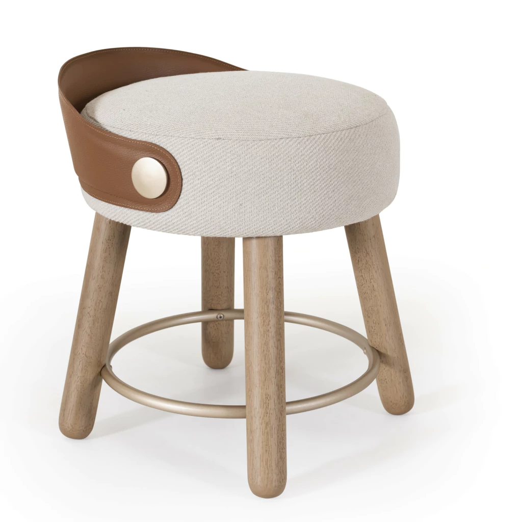 Banco Hugo | Designer: Pepê Lima O Banco Hugo é uma nova abordagem dos tradicionais banquinhos em madeira tão presentes na marcenaria artesanal milenar cujo estilo básico e prático perdura por milênios: quatro pés redondos e assento. O assento possui espuma encorpada e redonda para proporcionar conforto e reforçar seu aspecto lúdico. As famosas travas de madeira dos pés foram substituídas por um elegante anel metálico que acompanha o desenho do assento que pode também ser usado para apoio dos pés.