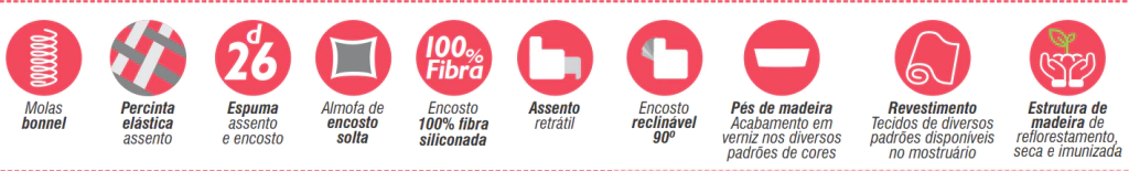 *Encosto - Reclinável em 90º, com espuma D26 revesdo com manta de espuma D20 so e manta siliconada; Almofadas soltas preenchidas 100% com fibra siliconada;
